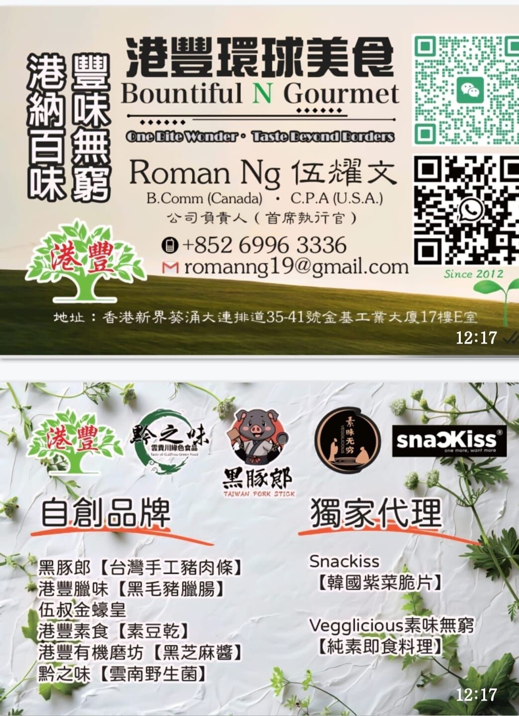 創辦人 Roman Ng 伍耀文先生,憑藉其專業的商學與會計背景,以嚴謹的態度精選每一款產品,不僅獨家代理韓國人氣零食「Snackiss」紫菜脆片、純素即食料理「Vegglicious」等國際品牌,更用心打造多個自有品牌,如選用台灣手工技藝的「黑豚郎」豬肉條、傳承港式風味的「港豐臘味」黑毛豬臘腸、健康天然的「港豐有機磨坊」黑芝麻醬,以及來自雲南山野的珍稀菌菇「黔之味」。